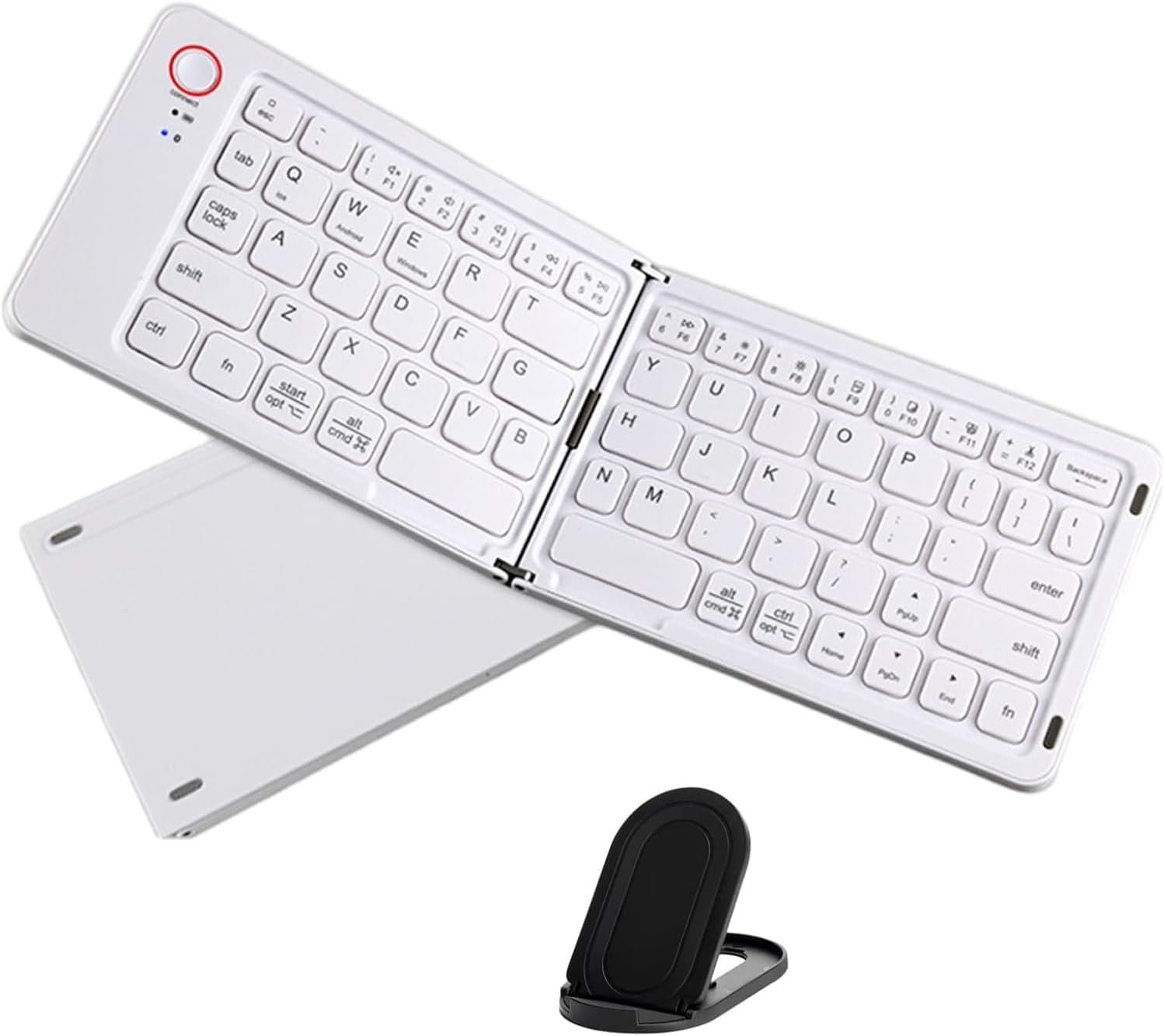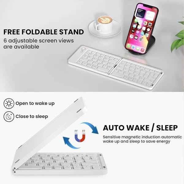 كيبورد بلوتوث صغير B023 قابل للطي وقابل لاعادة الشحن 5.1 – مزامنة حتى 3 اجهزة – خاصية الاستيقاظ/السكون التلقائي المغناطيسي المحمول لويندوز/اندرويد IOS/اللابتوب/التلفزيون (حامل مجاني) (ابيض)