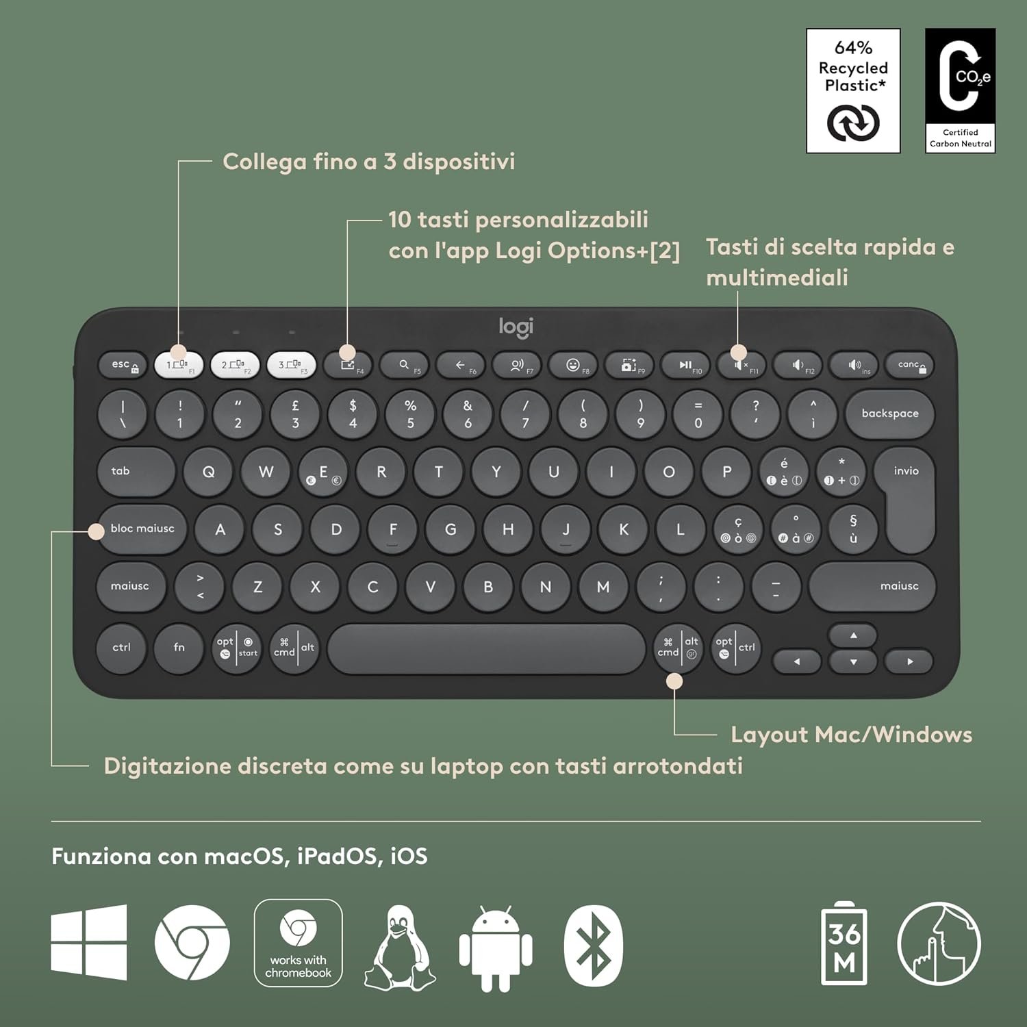 لوجيتيك مفاتيح بيبل 2 K380s – تصميم كويرتي ايطالي، جرافيت، بلوتوث