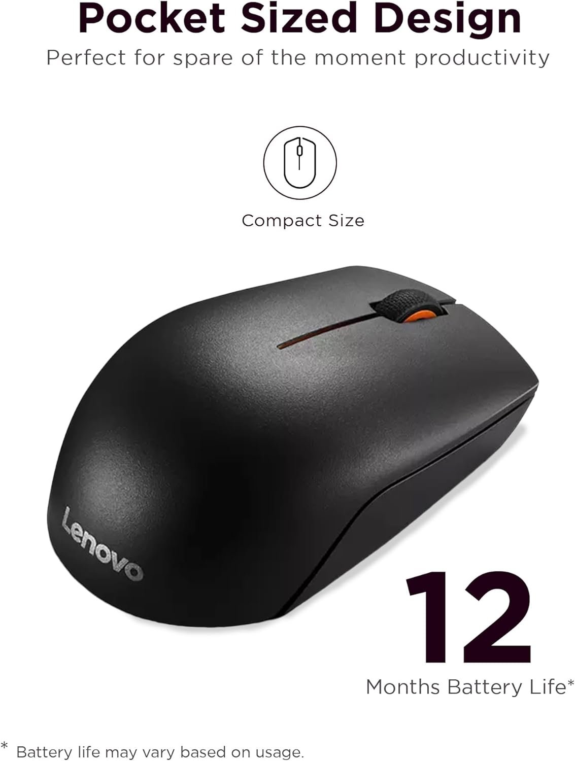 - صغير وخفيف الوزن – مصمم لسهولة الحمل والسفر، يزن الماوس اللاسلكي 300من لينوفو من 100 جرام فقط (3.5 أونصة) أو أقل، مما يجعل من السهل وضعه في شنطة الظهر أو شنطة الكمبيوتر المحمول